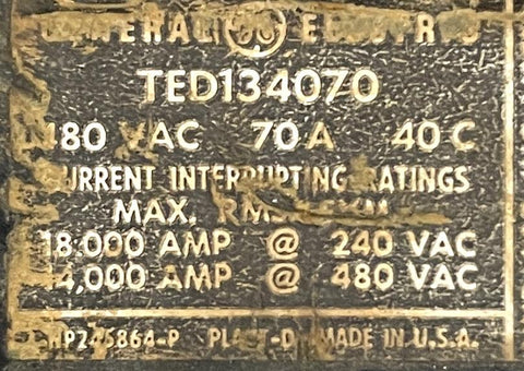 General Electric TED134070 3-Pole Circuit Breaker 70A 480VAC 3 Phase Bolt-On