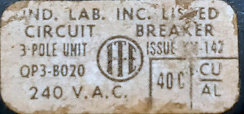 ITE QP3-B020 3-Pole Circuit Breaker; 3 Phase 20A 240V Plug In Mount