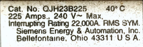 Siemens QJH23B225 3 Pole Circuit Breaker 225A 240V 3 Phase Bolt-On Mount