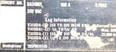 Westinghouse DA3400Y 3-Pole Circuit Breaker 400A 600V 3-Phase Bolt-On Mount