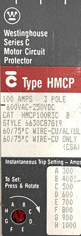Westinghouse HMCP100R3C 3-Pole Circuit Breaker 100A 600VAC 250VDC 3PH Feed-Thru