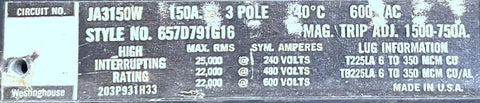 Westinghouse JA3150W 3-Pole Circuit Breaker 150A 600VAC