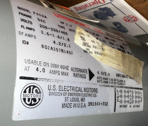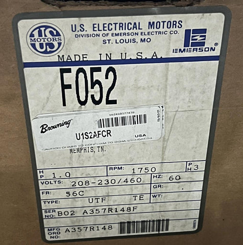 US Motors F052A Electric AC Motor 1 HP 1750 RPM 56C 208-230/460V 3 Phase F052