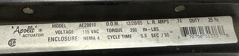 Apollo AE20010 Electric Actuator 115 VAC 11 AMP Torque 200lbs NEMA 4