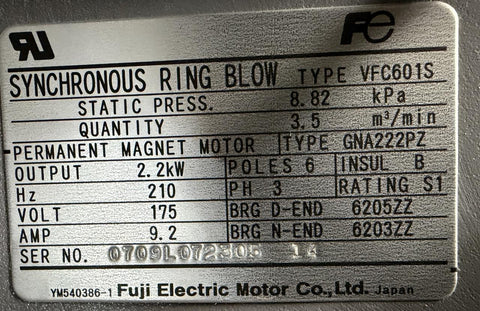 Fuji Electric VFC601S Synchronous Ring Blower 8.82 kPa w/ GNA222PZ Motor 2.2kW