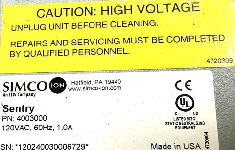Simco Ion 4003000 Sentry Ionizing Air Blower 120VAC 60Hz 1A 3-Speed