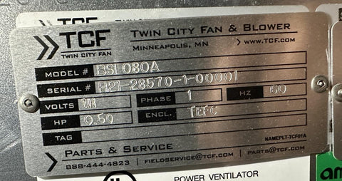 Twin City BSI-080A Power Ventilator Blower 1/2 HP 208V Single Phase