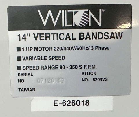 Wilton 8203VS 14" Vertical Bandsaw Variable Speed 80-350 SFPM 220/440V 3 Phase