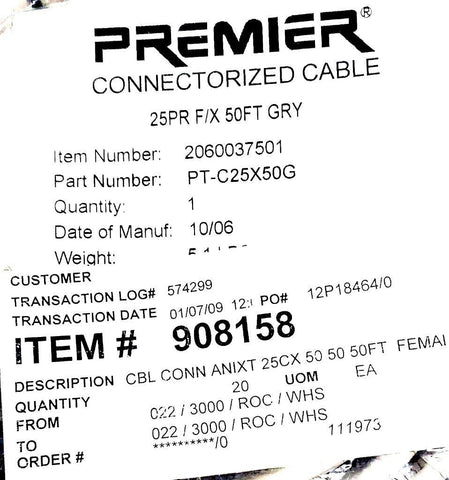 Premier PT-C25X50G Connectorized Cable 25PR 50Ft Gray 908158