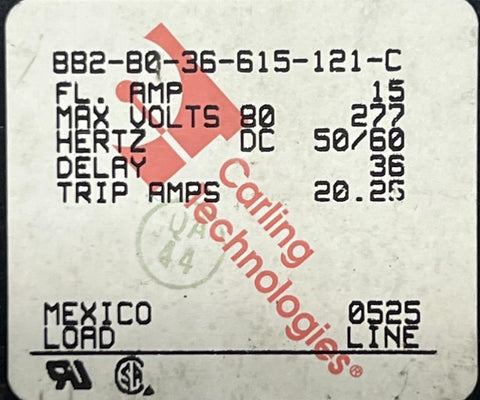 Carling Technologies BB2-B0-36-615-121-C Circuit Breaker 15A 80VDC 277VAC