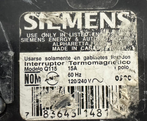 Siemens Q115 Circuit Breaker 1-Pole 120/240VAC 15A