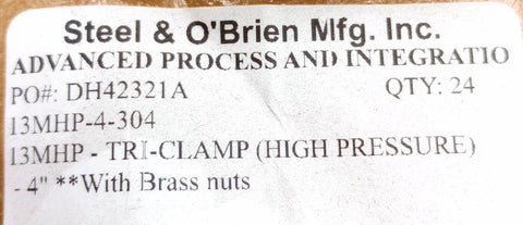 Steel & O'Brien 13MHP-4-304 4" High Pressure Tri-Clamp W// Brass Nuts SS