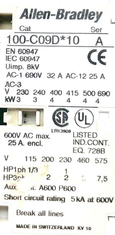 Allen-Bradley 100-C09D*10 Series A IEC Contactor 3PH 24VDC Coil 25A 600VAC