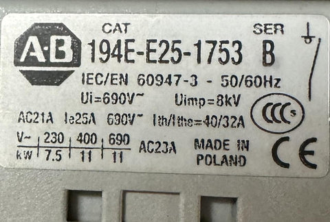 Allen Bradley 194E-E25-1753 Load Switch Disconnector Series B 25A 3-Pole