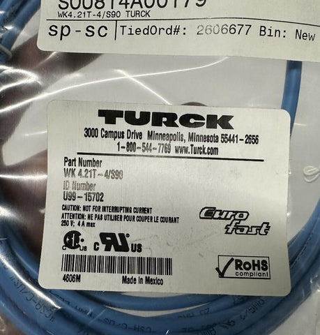 Turck WK 4.21T-4/S90 Cordset Eurofast Right Angle 4 Meters Female Connector 250V