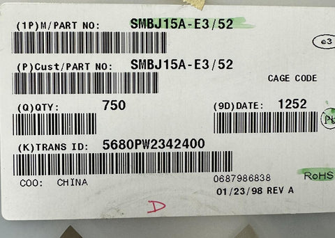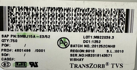 Reel of 632 Vishay SMBJ15A-E3/52 TransZorb TVS Diode 15V 24.4VC 600W DO-214AA
