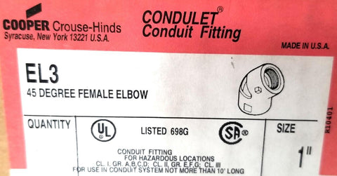 Cooper Crouse-Hinds EL3 Elbow Conduit Fitting Female 45° 698G 1" (Box of 4)