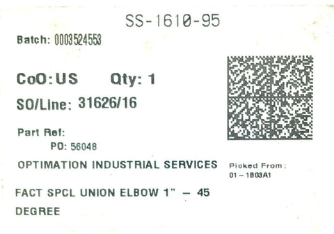 Swagelok SS-1610-95 Special Union 1" Elbow 45° 316 SS