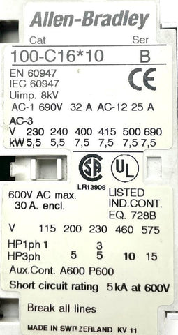 Allen-Bradley 100-C16E*10 Ser. B 3-Pole IEC Contactor W/ Diode 24VDC Coil 16A