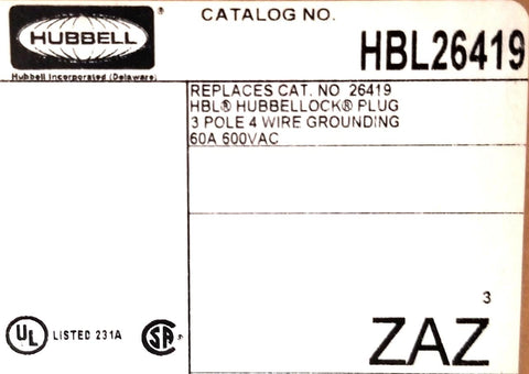 Hubbell HBL26419 Hubbellock Plug 3P 4 Wire 60A 600VAC