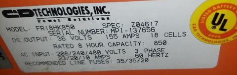 C&D FR18HK850 36V Forklift Battery Charger 18 Cell 850 AH 208/240/480V 3 Ph 155A