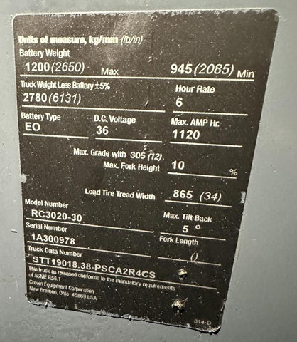 Crown RC3020-30 Standup Docker Electric Forklift 36V 3000LB 190" Lift Height