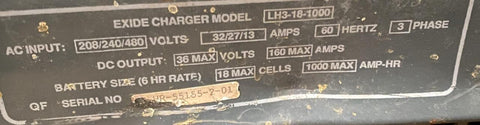 Exide LH3-18-1000 36V Electric Forklift Battery Charger 1000 AH 208/240/480V