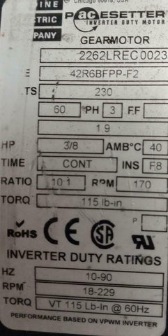 Bodine 42R6BFPP-F2 Pacesetter Gearmotor 3/8HP 10:1 Ratio 170RPM