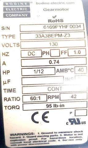 Bodine Electric 33A3BEPM-Z3 Parallel Shaft DC Gearmotor 42rpm 130V Series Z