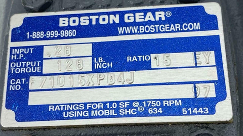 Boston Gear 71015XPB4J Speed Reducer 15:1 Ratio .28 HP 128 Torque