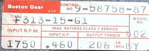 Boston Gear F313-15-G1 Right Angle Gear Reducer .460HP 1750RPM 206In.Lb. Torque