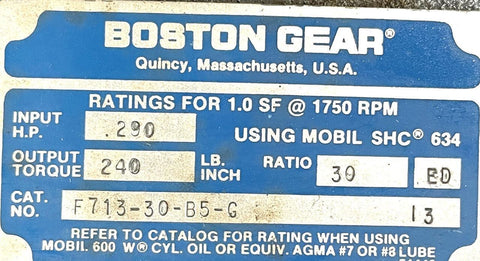 Boston Gear F713-30-B5-G Speed Reducer 30:1 Ratio 1750RPM 5/8" Bore 6.07" OAL
