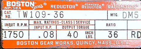 Boston Gear TW109-36 Flanged Speed Reducer 1750RPM .08HP 40 In.Lb. Torque