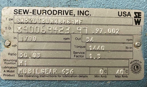 Gearbox Model: SA52DT80N4BM61 Input RPM 1700 Ratio 50.03 Torque 1440 Lb-In Output RPM 34 ~ International bidders are always welcome ~