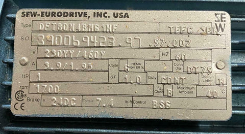 You are Purchasing a Sew Eurodrive Motor and Gearbox. Model: DFT80N4BH61HF This Motor and Gearbox are in Great Condition and Fully Guaranteed. 230/460 60 Hz Amp Rating 3.9/1.95 HP 1.0 TEFC RPM 1700