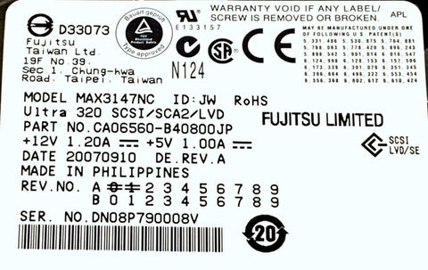 Fujitsu MAX3147NC Hard Drive Ultra 320 SCSI/SCA2/LVD CA06560-B40800JP