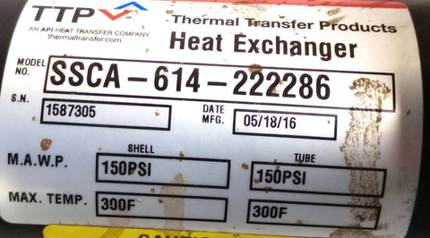 Thermal Transfer Products SSCA-614-222286 Heat Exchanger 150 PSI Max 300°F Max