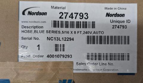 Nordson 274793 Blue Series Hot Melt Glue Hose 8′ Length 5/16" Diameter 240VAC