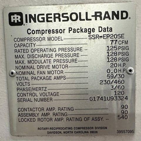 Ingersoll Rand SSR-EP20SE Rotary Screw Air Compressor 20 HP 77 CFM 125 PSI