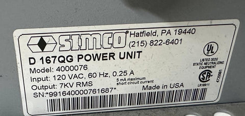 Simco D-167QG Static Eliminator Power Unit W/ Air Gun 120VAC 60 HZ 7KV 4000076