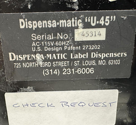 Dispensa-Matic U-45 Automatic Label Dispenser 115 VAC 50/60 HZ