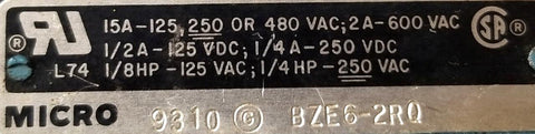 Micro BZE6-2RQ Limit Switch 9310 1/8 - 15A 125-250VAC 1/4A 250VDC