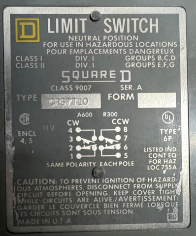 Square D 9007CR67T10 Limit Switch Series A Type 6P Neutral Position