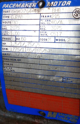Magnetek 6-963764-40 Pacemaker Motor 1.5HP 230V 3PH 60HZ 1775RPM 5.3A