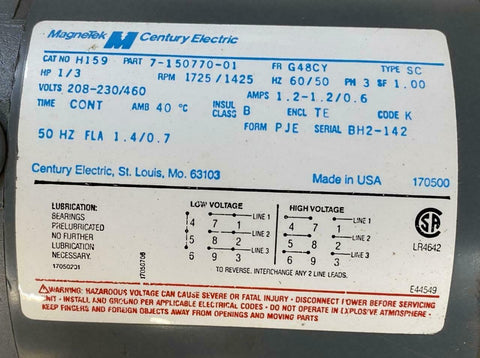 Magnetek Century 7-150770-01 H159 3-Phase AC Motor 1/3 HP