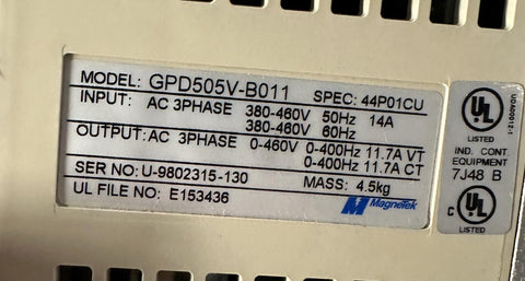 Magnetek GPD505V-B011 AC Drive 7.5 HP 380-460 VAC 50/60 Hz 3‑Phase