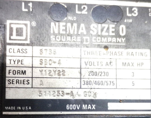 Square D 8736SB04 Series A Reversing Magnetic Starter NEMA Size 0 3-5HP 600V Max