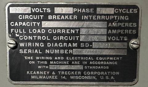 Kearney & Trecker Model D Horizontal Milling Machine 4000 RPM 220V 3 Phase