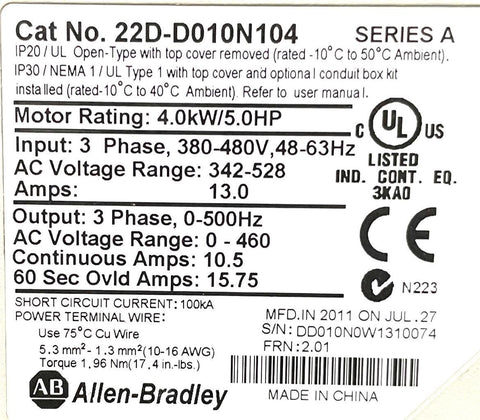Allen-Bradley 22D-D010N104 Ser. A PowerFlex 40P Adjustable AC Drive 4.0kW/5.0HP