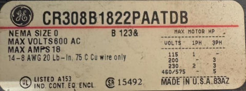 General Electric CR308B1822PAATDB Motor Starter 600 VAC Nema Size 0